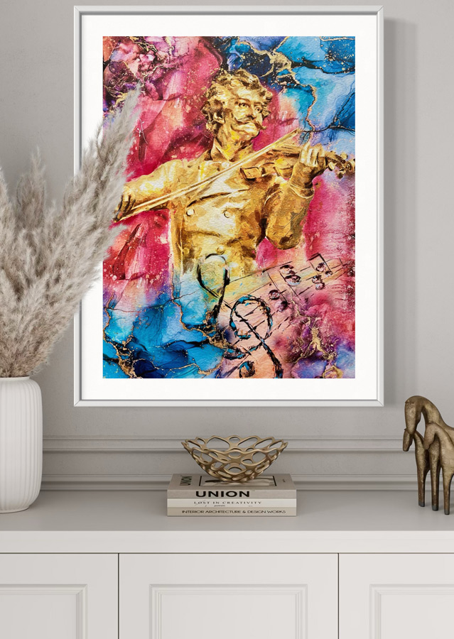 Umgeben von sanft geschwungenen Notenlinien, die in warmen Goldtönen erstrahlen, fängt dieses Bild die Leichtigkeit und den Schwung von Strauß‘ Musik ein. Die Darstellung verkörpert die Eleganz und Lebensfreude seiner Werke.