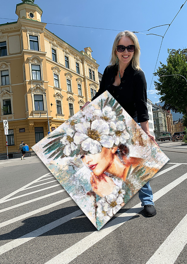 Das „Wildröschen“ ist ein abstraktes Gesicht einer Frau mit Blumenkopf und das erste Acrylbild meiner neuen Alpenblumen-Kollektion. Das romantische Wandbild zeigt eine hübsche Frau mit den Blüten der Wildrose und den Schwingen des majestätischen Tiroler Adlers. Dieses zauberhafte Kunst Gemälde ist in meinem kleinen Atelier in der Nähe von Innsbruck in Acryltechnik entstanden.