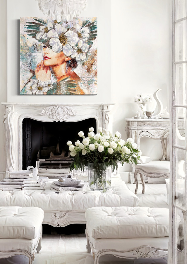 • Romantisches Wandbild auf Leinwand vom abstrakten Gesicht einer Frau mit Blumenkopf. Dabei habe ich die zarten Blüten von Wildrosen eingearbeitet.
